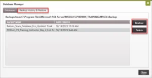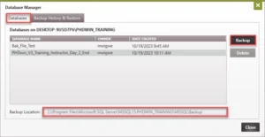 ·Manual Backups: This is a backup that is initiated and managed by the user. This section of the helpfile focuses on this type of backup. You create and restore backup your databases from within PHDwin or using MS SQL Server Management Studio.