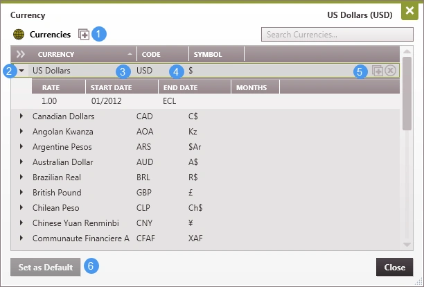 The default currency is displayed in the upper right-hand corner. Change this by clicking on another currency and clicking Set as Default ( ).
