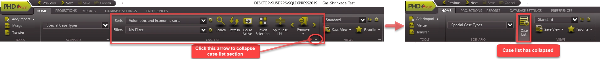 To Collapse Sections in the Ribbon: To condense the ribbon tab, click on the arrow on the right side of the section to collapse it. For example, to minimize/collapse the Case List section in the Home Ribbon, this is what it would look like the image below. To restore the case list, hover over the minimized case list and click on it.