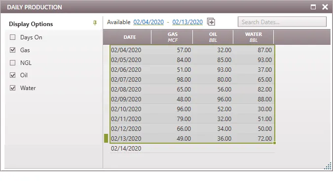 The Daily Production form is used to enter and view daily production data on the active case. The available products are Days, Gas, NGL, Oil, Water, and any other non-ratio, non-cumulative monthly products in the active Phase Configuration. The daily data products can be displayed and projected on the graphs just like monthly data. Users can also copy and paste daily production data from Excel into this form to simplify importing data.