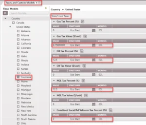 To view the fiscal regime that has been applied to a case, click on the Forms Flyout and then double-click on Tax and Custom Models. On the left-hand side of the Tax and Custom Models form, a list of available Fiscal Models in the database is displayed. If a fiscal model has been applied to the case, a checkbox is placed next to the State name (for United States) and the tax rates are displayed on the right pane as State/Local Taxes.