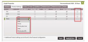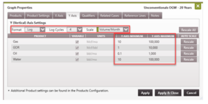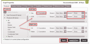 7.By default, Oil and Gas are added as products on the graph. Double-click on the graph to open the Graph Properties window. In this window, add the desired products by dragging it from the list of Products on the left and place it either on the Left Axis or Right Axis panes.