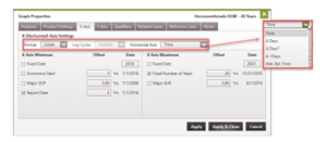- Offset – For some options checked, an offset can be specified. The actual X Axis Maximum is the selected date plus the offset. In the image below, a 20-year model is being set up. The Fixed Number of Years offset of 20 years means the total length of the X axis is 20 years beginning from 1/1/2016 to 12/31/2035.