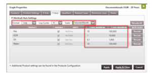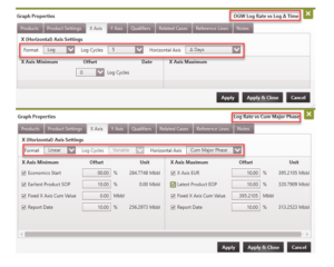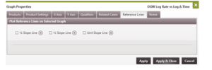 Open a rate-time graph and double-click on the graph to open the Graph Properties. To turn on the Reference Lines, the graph must have these settings: a. On the X Axis Tab – Set the Horizontal Axis format to “Log” and set the Horizontal Axis units to Delta Days or Mat. Bal. Time. b. On the Y Axis Tab – Set the Vertical Axis format to “Log”.