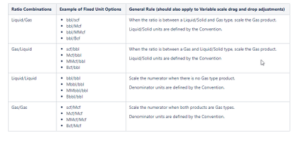 The table below shows the different units for displaying ratio products. To set units to the values specified in the table for a given ratio product, uncheck the box under the Variable column and use the drop down under the Units column to select the appropriate unit for the product. If you are unsure on what unit is appropriate, leave the Variable column checked to allow PHDwin determine the right unit for you.