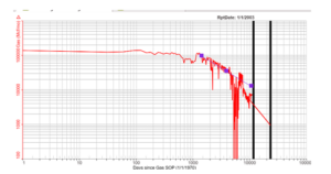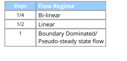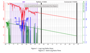 If the historical data is plotted on a log-log plot where the units of the horizontal axis are Delta Days or Material Balance Time, the flow regime of the well can be determined. This cannot be seen on semi-log rate time plots. Knowing the flow regime can help to improve the accuracy of production forecasts. In most cases, the slope of a line that fits along the historical data points will dictate the state of the well.