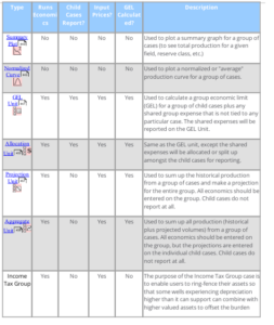 Before going into the specific kinds of Group Cases that exist in PHDwin, it is important to identify a couple general terms in relation to Group Cases. Group Cases are either Non-Economic or Economic. Simply put, Non-Economic Group Cases serve to analyze production data, instead of focusing on Cash Flow. Economic Group Cases, however, function as a way to calculate cash flow models in ways where a single case would be too limiting. When generating reports on Economic Group Cases, depending on the type of Group Case, users can output summary reports of the parent and child cases to determine the total life, potential profitability, and Group Economic Limit. Economic Group Cases are useful to model the true condition of the field and ensure accuracy in data.