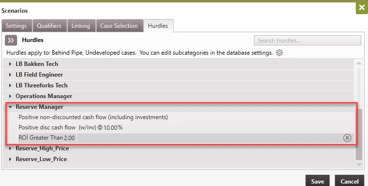 •Positive Non-Discounted Cash Flow with Investments – In order to prevent negative values from being printed on reports, this Hurdle would be useful for filtering out cases with negative values of non-discounted cash flows (cash flow – investments). This is a strategic method to remove cases that are non-commercial and only run reports on the commercial cases. A case is only considered commercially economic and reported if the non-discounted cash flow including the investments is positive.
