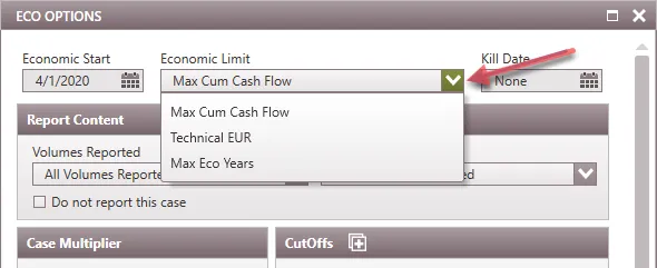 •Technical EUR – The case is forced to run up until the technical Estimated Ultimate Recovery (EUR). This means that it runs until the end of either the monthly history or projection, whichever is later. It does not matter if the cash flow is positive or negative.