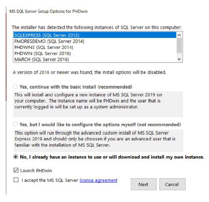 oYou prefer to install a different version of SQL Server. The install file will install an instance of Microsoft SQL Server Express 2019. PHDwin is compatible with Microsoft SQL Server (or SQL Server Express) 2012, however, we recommend using version 2019 or newer.