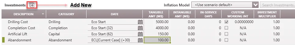The investments form can be used to add one-time capital investments to the case. Investments differ from expenses because unlike expenses, which recur, investments are one-time costs such as Drilling Costs, Completion Costs, Capital and Abandonment costs. They are qualified by scenario. You can view or change the current investment qualifier by going to the scenario hierarchy. You can add investment categories, choose how they report and assign depreciation models in the database settings.