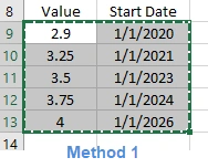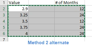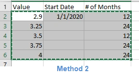 •Method 2: Value & Number of Months that the segment should last. For this method, use three columns and specify only the first row of the second column (start date) which serves as the initial date of the model. Alternatively, set the start date correctly in PHDwin and leave the second column completely empty in Excel. The second column is needed because that is the location of the Start date in PHDwin. So, for this method to work correctly, use 3 columns as explained.