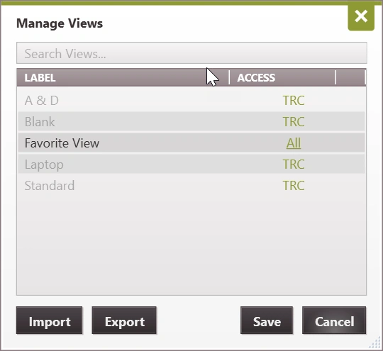 ·Click on the to delete a view. Note that the TRC views cannot be deleted – they are used for support purposes.