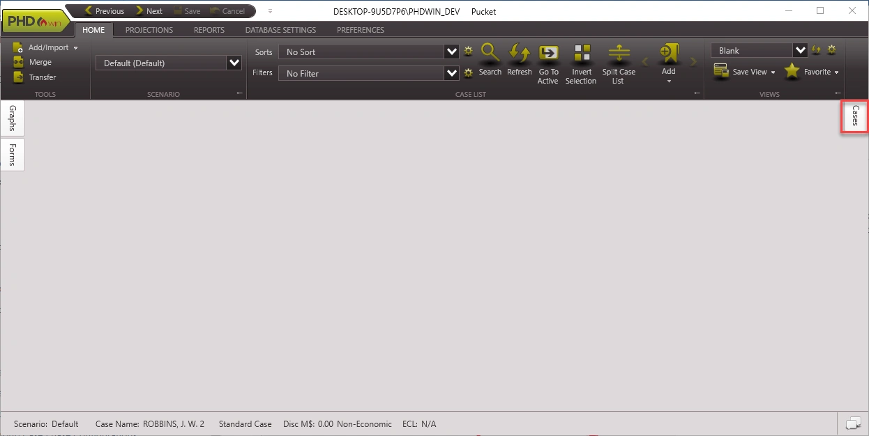 Following Microsoft standards, PHDwin utilizes Ribbons at the top of the program for navigation. The Ribbons are organized into tabs by the data they present and are your primary mode of navigation throughout the GUI. Ribbons present different capabilities for importing and creating new cases, editing cases and forms being displayed, forecasting inputs, altering settings, and producing reports, etc. There are five ribbons that correspond to the functions that users are able to utilize. To increase available workspace, you can right-click on the ribbon and select “Minimize the Ribbon”. All ribbon options will still be available when you click on the ribbon tab label and will automatically collapse when you click outside of the ribbon. You can restore the ribbon to be persistent by right-clicking any of the ribbon tab labels and selecting “Minimize the Ribbon” again.
