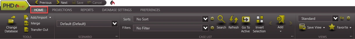 The Home Ribbon is used to manage the case list and interface configuration preferences. The user may bring in new data, transfer database out of the instance, toggle between scenarios, sort and filter cases in the case list, and customize their display. The user may also switch to a new database and/or instance from the Home Ribbon.