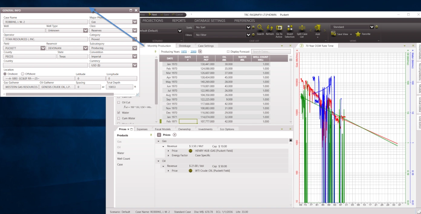 The Projection Ribbon is one of the ways for altering the projection data used in evaluations. The user may toggle between the products they are projecting, edit the parameters of each of the projection types and segments, view cumulative, technical remaining and technical EUR for the selected product, determine appropriate curve fit and manipulate the curves and display information on the graphs. Users can save, apply, and manage graph models as well as set the appropriate Phase configuration for the case.