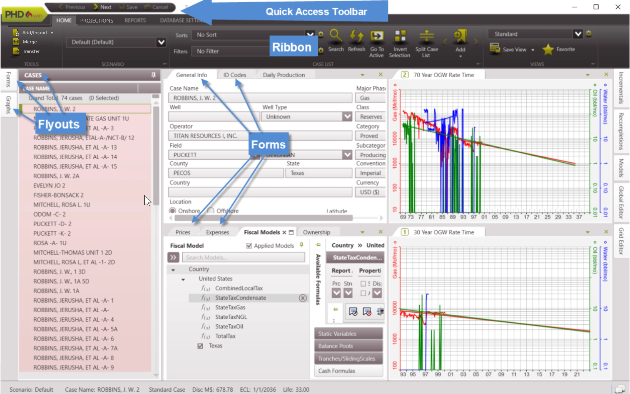 ·Flyouts PHDwin has flyouts on the left and right corners of the GUI. On the left-hand side, the flyouts are Cases, Forms, and Graphs. The Cases flyout shows all cases or wells in the project in the case list. The Forms and Graphs flyouts have a list of windows that can be added to the current view by double-clicking on them. On the right-hand side, the flyouts are Incrementals, Recompletions, Models, Global Editor, and Grid Editor.