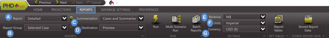 The Reports Ribbon is where users can select which cases to include in a report and the report type they would like for their particular need. The program contains various reports with different output catered to different client needs. Report settings like the unit convention or currency to use throughout the report can be modified here. Users also have the ability to add new or edit existing report tables to be used with standard and custom reports. Previous stored report runs can also be accessed here.