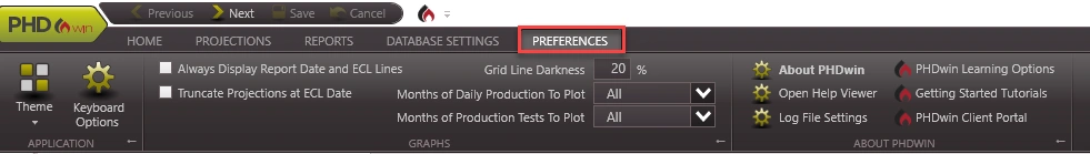 The Preferences Ribbon is where users can modify settings unique to their individual needs. This includes application settings such as @keyboard shortcuts and program @themes , help file viewer, PHDwin online resources, and graph display settings.