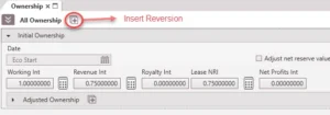 The ownership form can be used to edit the initial ownership on the case and schedule reversions, or changes in ownership, into the future. You might want to schedule a reversion in the future if you know there will be a change in working or royalty interest due to the buying or selling of interests. This allows you to assess the feasibility of buying or selling a portion of the assets and analyze how it affects the cash flow projections.