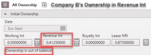 Revenue Interest: To model an override using the Revenue Interest (RI) cell, add the override amount to the existing RI without adjusting the other two values in the equation. To model a burden, subtract the burden amount from the existing RI without adjusting the other two values in the equation. Although the ownership form displays the “Ownership is out of balance” message when this happens, the program will run as expected and the cash flow report will indicate that the correct numbers were calculated.