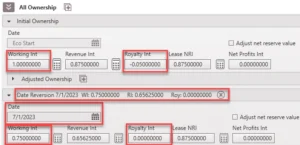 3.Enter the new ownership values (WI, RI, Royalty interest, & LNRI) for the case after the reversion is triggered.