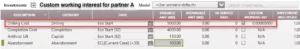 To add custom WI, go to the investment tab. Add the appropriate investment as discussed under the investment form. Then click the check box for custom working interest and add the required value between 0 and 1. See the example below where partner A does not pay for the drilling cost.