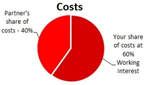 In this next example, you found a partner to help you with the costs of the well. You have a WI of 60%, and your partner takes on the other 40%. Since you are taking on a higher share of the burden, it is only fair that you get a proportionately higher share of the revenues.