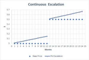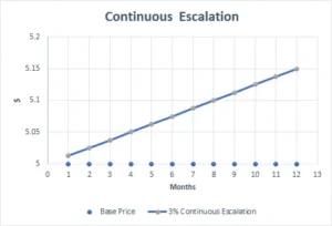 Notice that for the years that have the same price strip, the escalated value is compounded from the previous year value. For instance, year 2 escalated value is calculated from 3.41 + 3.41 x 0.05 = 3.58.