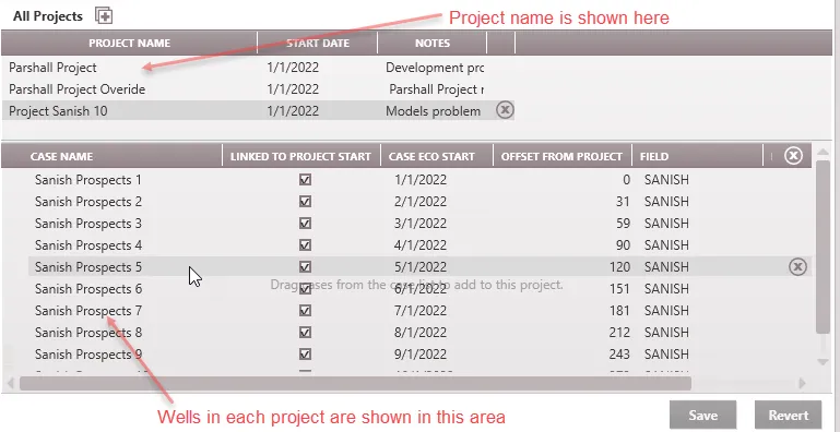 The Project Manager form can be used to create projects in PHDwin to group one or more cases together by a common project name and start date. This can be useful for sorting or filtering by project name to simplify the assessment and reporting of those cases. Since a project has a start date, you can link the cases to that start date, which makes it really easy to reschedule a group of cases in the future if project constraints change or a need to assess the feasibility of different timing schedules arises. This can be useful for organizing a group of drilling prospects that are tied to a certain start date. Creating Notes for each project is a good practice to help keep track of the details of each project.