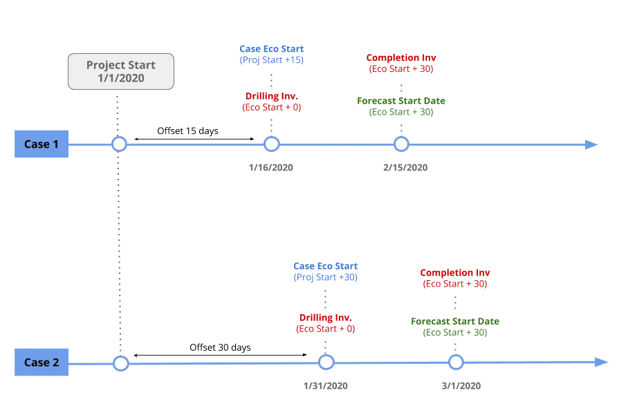 If the Case Eco Start to the Project Start Date are linked, edit the case start date or the offset using the Project Manager. If the cases are set up correctly to utilize other linked dates, it becomes simple to move projects around in time with confidence that the timing of investments and start of production are occurring on the correct dates.