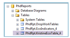 - Find the name of your table – it will be named something such as “PhdRpt.YourTableName”. For example, if the table is named “KristineEcoTable”, it will appear in SQL Management Studio as PhdRpt.KristineEcoTable. Each table name also has a number appended to the end. The number begins at 1 and increases by 1 each time the report is run.