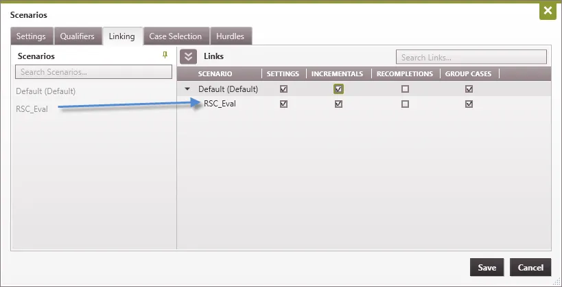 You can link as many or as few of these items as you’d like. If a Scenario is linked, it will automatically include the same cases as the main Scenario. This is done, because you need to have the same cases available in order to ensure that the inter-case links (such as Incremental or Recompletion Links) can be set up properly. Once Scenarios are linked, any changes made to linked items in any Scenario will be shared with all Scenarios here.