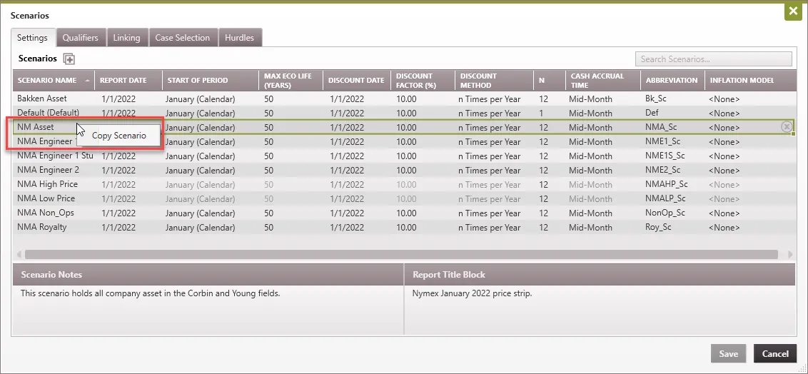 3.Make any desired changes in the Scenario Settings, Qualifier Hierarchy, Hurdles, etc. Note that a “1” may be appended to the new scenario name to maintain unique naming conventions.