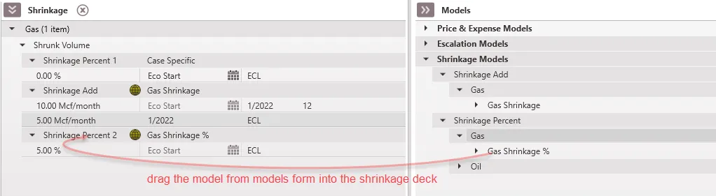 Shrinkage is an adjustment applied to the gross volume of a product to account for the loss of the product during production, whether it be a known value or an estimate. The loss of product can be due to a number of reasons. Oil product could shrink due to changes in pressure, temperature, and fluid properties at the separator(s), leading to the release of dissolved gas. Gas could shrink for the same reason (leading to NGL extraction); it could be re-utilized onsite for gas lift operations, to run the compressor, or for electricity. Some of the gas could be flared for various reasons. As a result, only a certain fraction of the produced gas makes it to market. Hence we use shrinkage to go from gross volume to shrunk volume. Shrunk volume is then used to run economics. Shrinkage can be applied to any volume based product in PHDwin, as shrinkage factors will be applied to the gross volumes. The shrinkage can be entered as a percentage if it is an estimate, a fixed volume per month if it is a known value, or both. The Shrinkage form is used to add or modify the Shrinkage value for each case. Shrinkage models can be set up and applied to cases as shown in the example below. Creating a shrinkage model can save time especially when applied to multiple cases at the same time. In addition, using a model means users have one location to update shrinkage value rather than going into each case to update the shrinkage.