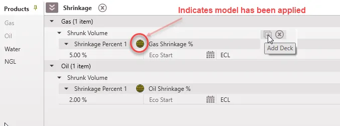 button next to the Shrunk Volume line to add another shrinkage deck. The second will be a fixed volume per month, and the third will be a percentage. The shrinkage decks will apply in the order that they appear on the shrinkage form. To add only fixed volume deck, leave the first shrinkage percent deck as 0% and input value for the shrinkage Add deck. To apply a single shrinkage factor, use the first or second deck to model that percentage or volume adjustment. Both percentage and volume adjustment can be applied. This should be done using either the first and second, or second and third decks, depending on the user’s preference on which should be applied first.