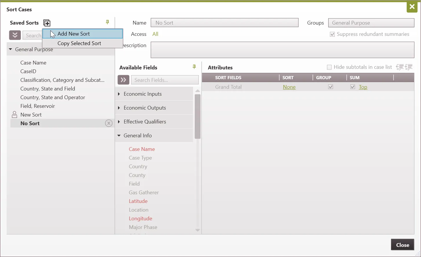 •Groups – the grouping the sort name will be categorized under on the left-hand side showing Saved Sorts. Available groups are: Display, Economics, General Purpose, and Reports.
