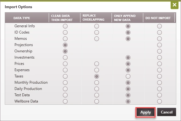 You can import production volumes into PHDwin from Excel or several standard file types from various data providers. When you do an import, it can be to update existing cases or add new cases. If you can download production data into one of the standard file types that are mapped up for PHDwin, the data imports automatically since the format is known and the import is pre-mapped for you.